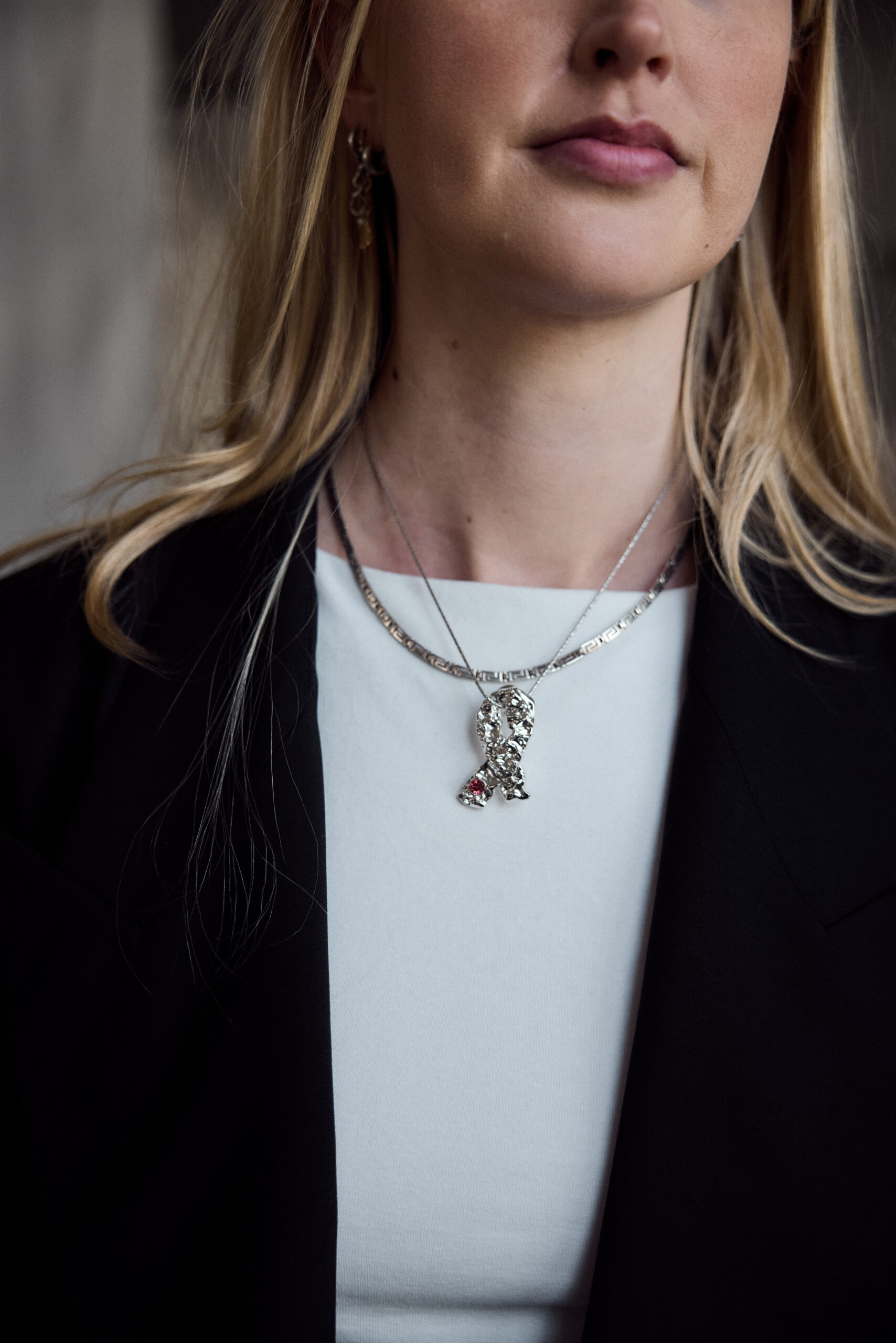 – Sløyfen er et symbol på livet, med sine bølger og klipper. Livet er ikke flatt, det har både oppturer og nedturer. Designet har en råskap og styrke ved seg, som man må ha når man blir berørt av brystkreft, sier kreativ leder i ENVELOPE1976, Celine Irgens Aagaard om årets sløyfe.